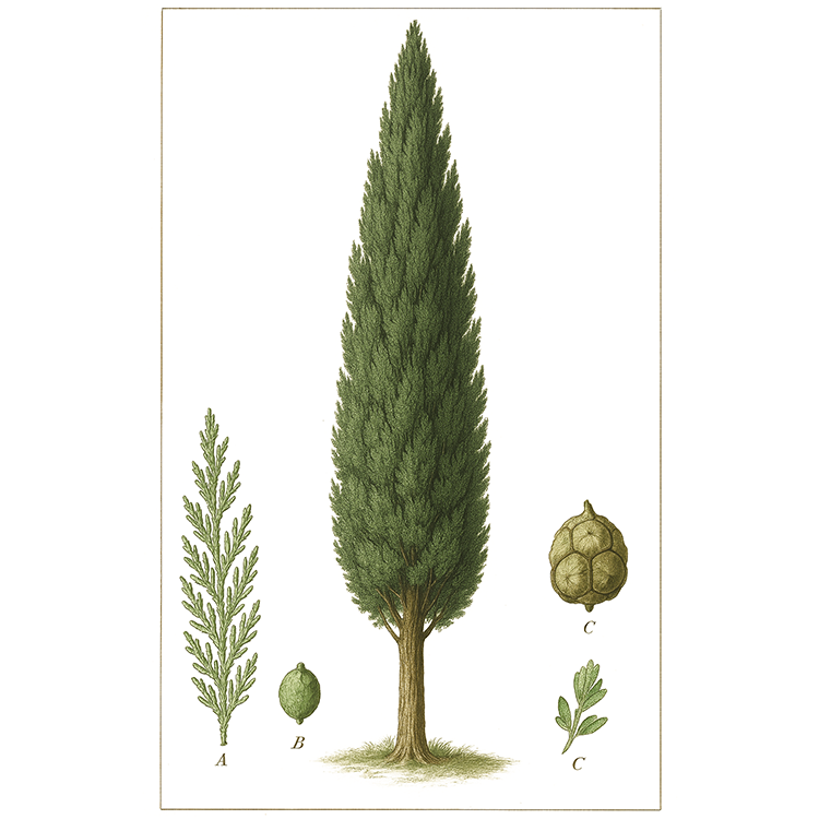 Ce cyprès d’Italie produit peu de fruits, ce qui lui permet de garder une végétation resserrée et une silhouette impeccable au fil du temps.
