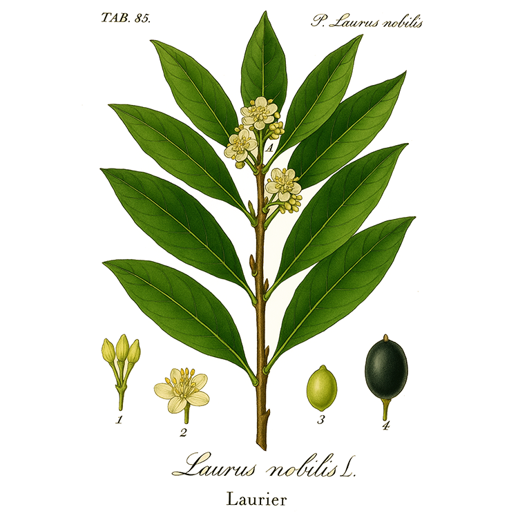 Le laurier-sauce est un arbuste ou petit arbre méditerranéen à feuillage persistant, largement cultivé pour ses usages culinaires et ornementaux. Ses feuilles coriaces, lancéolées et luisantes dégagent un parfum aromatique caractéristique qui en fait un ingrédient incontournable de la cuisine méditerranéenne, notamment dans le bouquet garni. Au printemps, il se pare de petites fleurs jaune pâle, discrètes mais nectarifères, suivies de baies noires ovoïdes à l’automne.